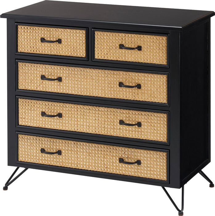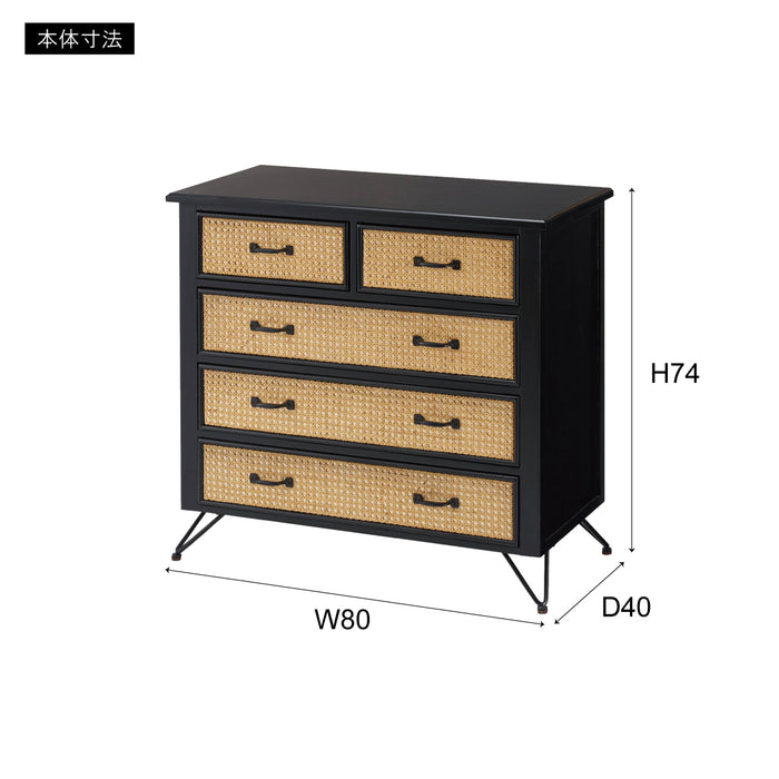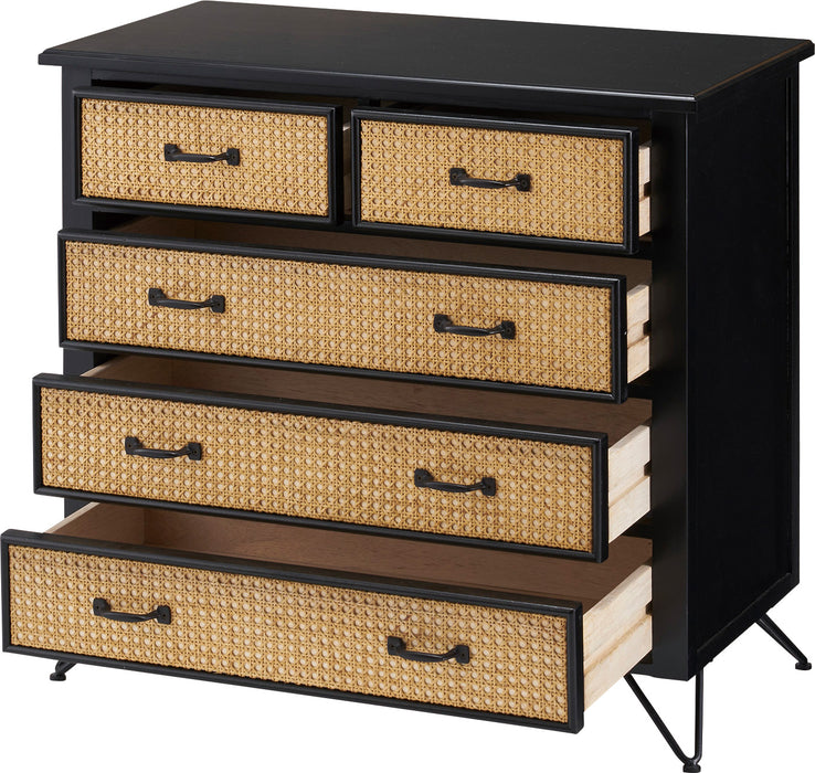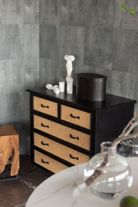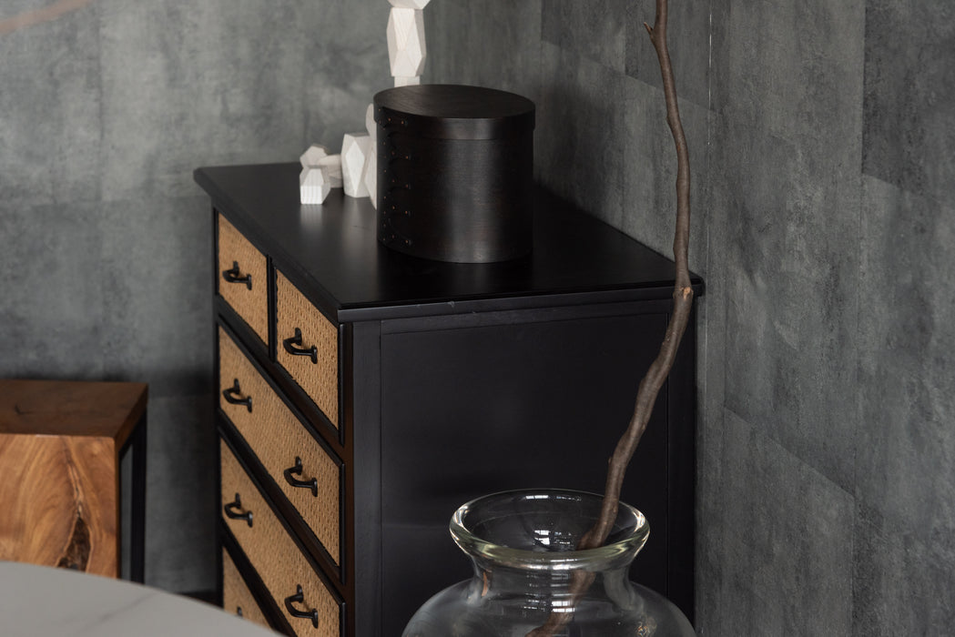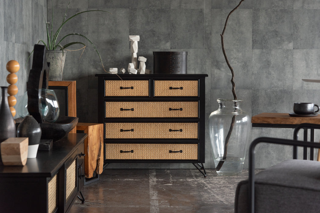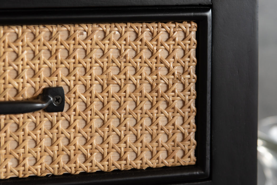 温かみがありながら、クールな印象も与えるブラックのウッド素材と、モダンな雰囲気のある天然ラタンの組み合わせは重厚感あるブラックにラタンのベージュが差し色になり、お部屋に圧迫感を与えず抜け感のあるトレンド感溢れるデザインに。