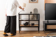 天然木とラタンを使用したナチュラルなイメージのデザインながら、ターンドレッグ(ろくろ脚)を採用することで、クラシカルな雰囲気も感じられるオープンシェルフ&サイドテーブル。