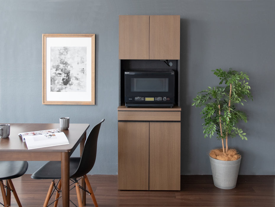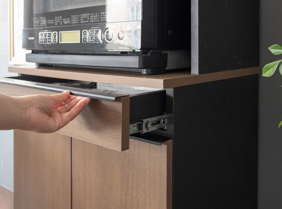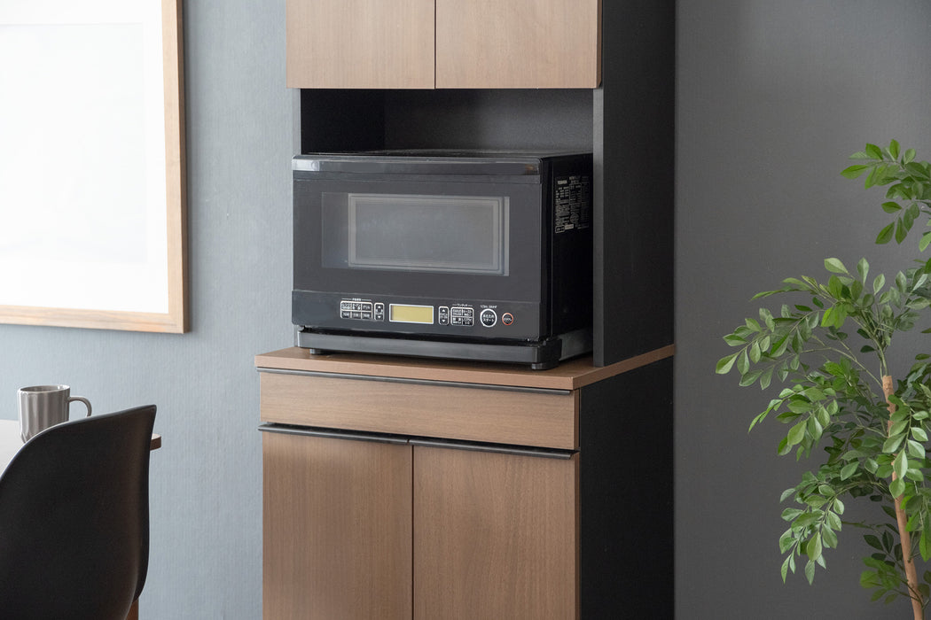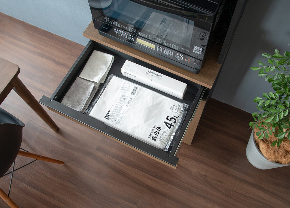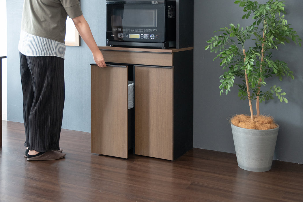 電子レンジや食器、調味料が収納できるラック付きで、デッドスペースになりがちなゴミ箱上を有効活用できます。