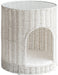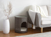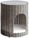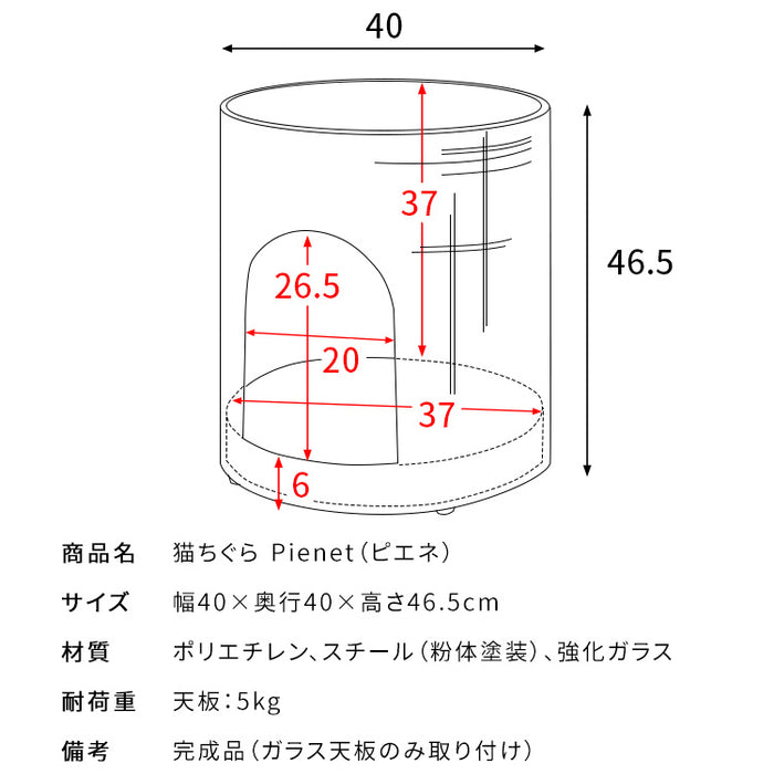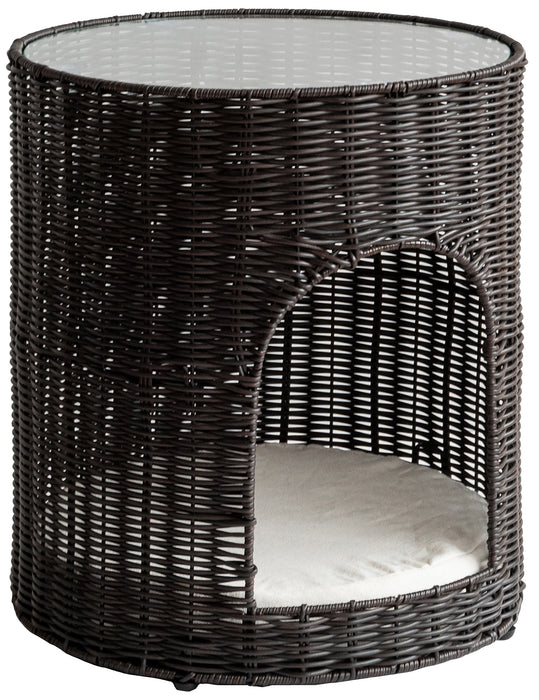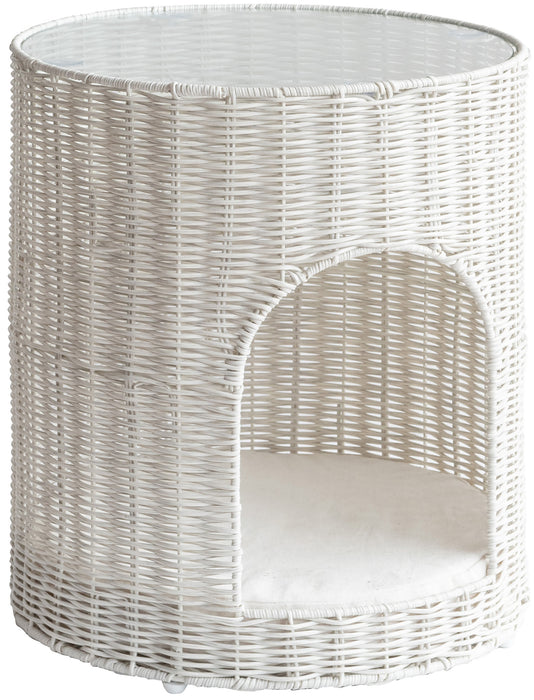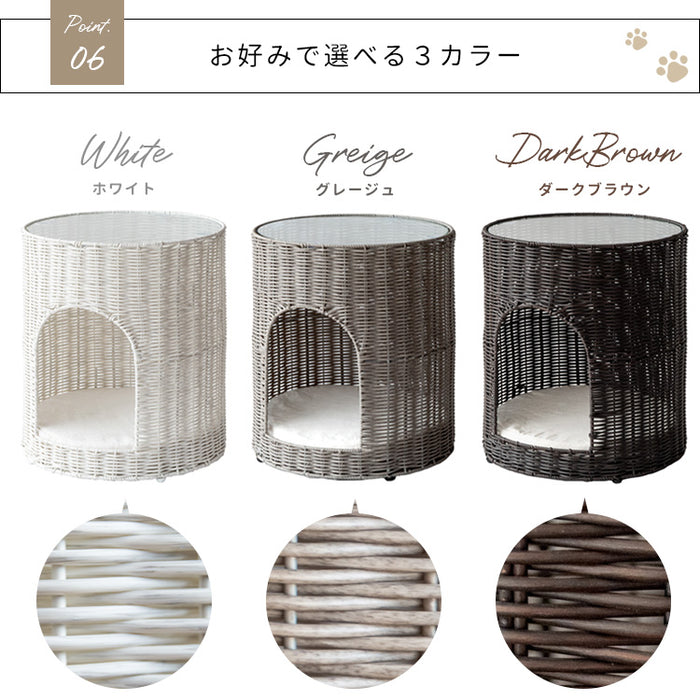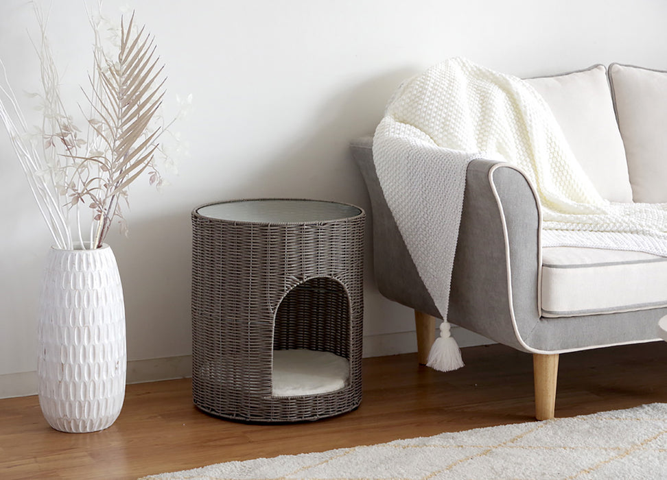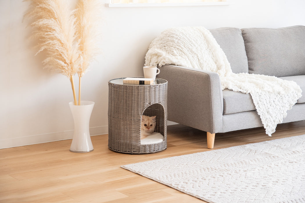 サイドテーブルとしても使える樹脂製ラタンの猫ちぐら『Pienet(ピエネ)』。透明なガラス天板は、上から中に居る猫ちゃんの様子を確認することができます。