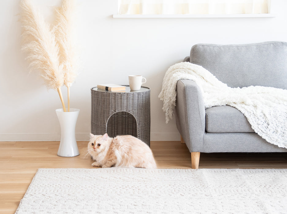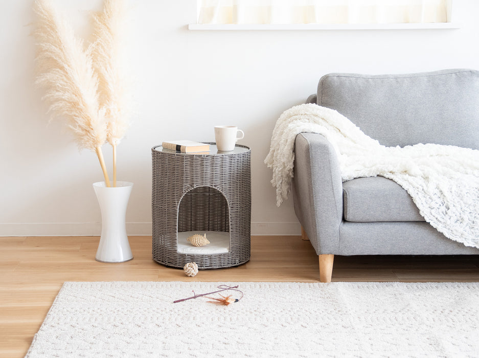 丈夫でおしゃれな樹脂製ラタンはリビングに馴染み、くつろぎながら猫ちゃんとの大切な時間を過ごすことができます。