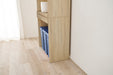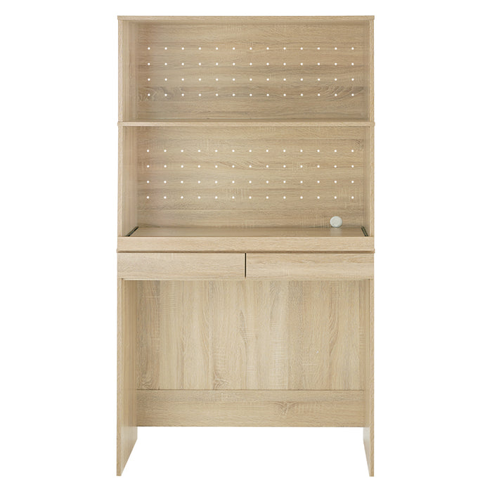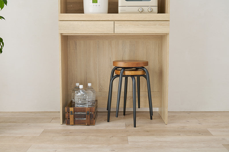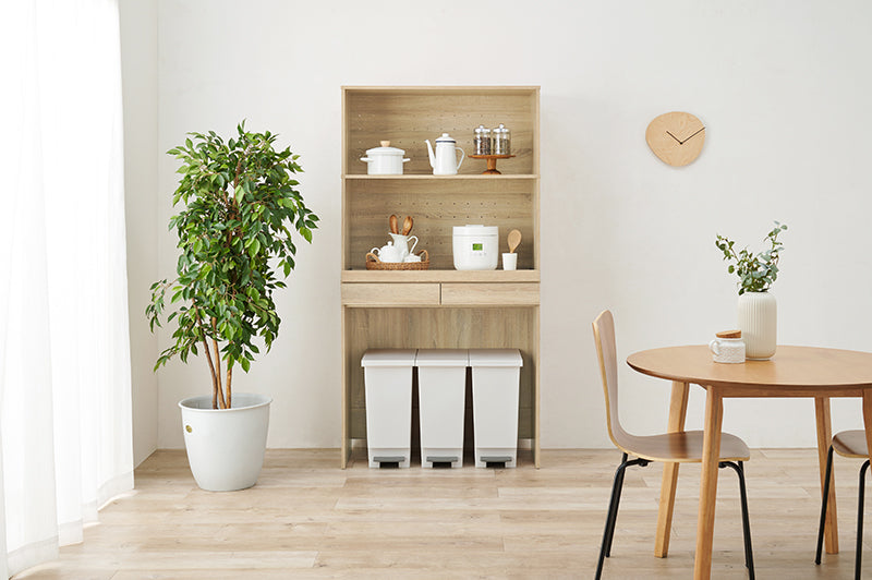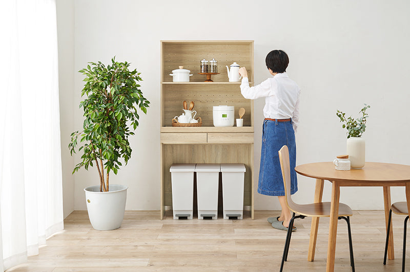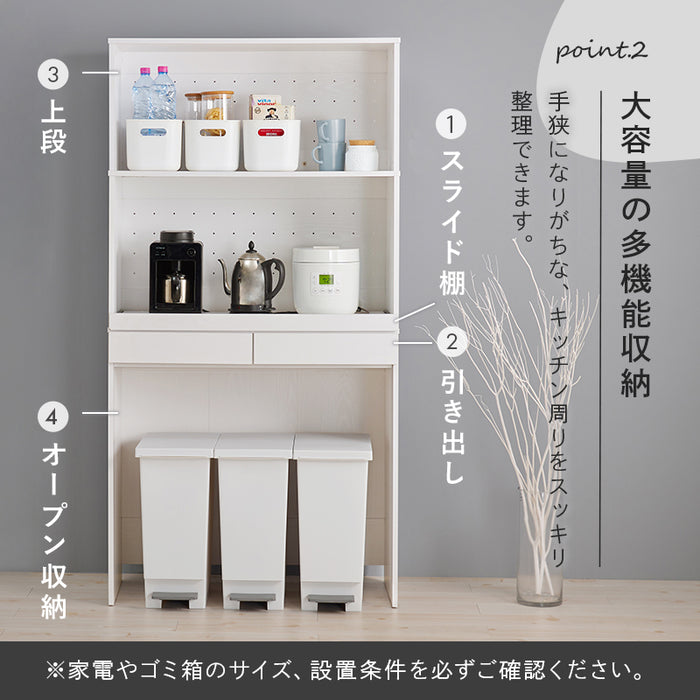 | サイズ | 全体サイズ:約W88×D41.5×H172cm スライド棚:約W82.5×D35㎝ スライド棚収納:約W84.5×D38×H43cm 引出し:約W36×D33.5×H4cm 上段収納:約W84.5×D38×H38.5cm オープン収納:約W84.5×D38×H73cm |