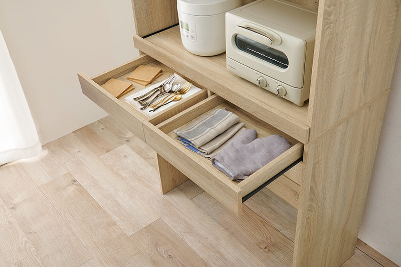 引出しやスライド棚付きでキッチン家電も使いやすい。