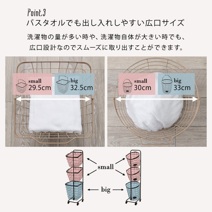 丸型のバスケットが3段付いた、ランドリーラックです。